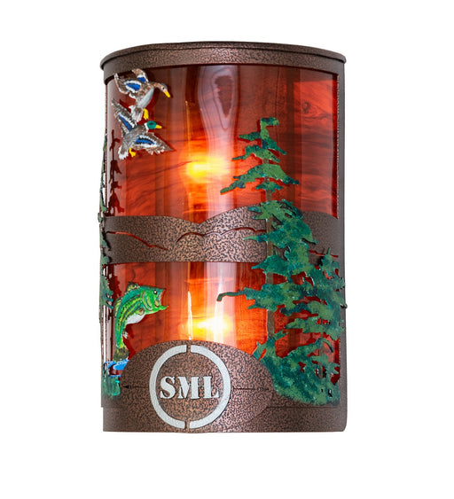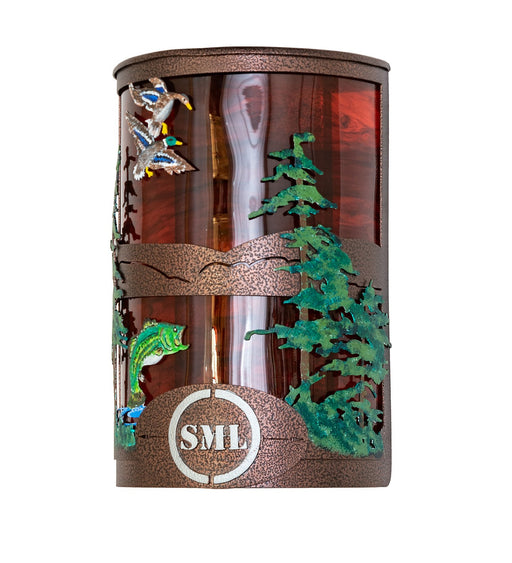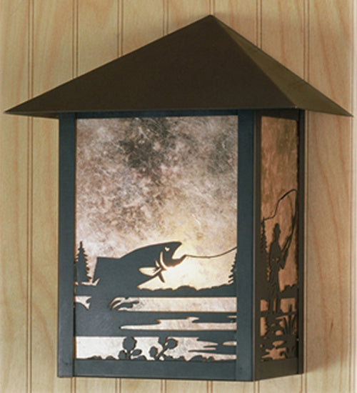 A Fly Fisherman landing his catch is depicted on this handsome American Craftsman lantern style wall sconce. The fixture, handcrafted in the USA by...