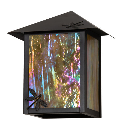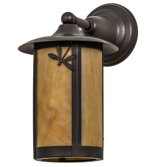 A solitary Dragonfly accents the edge of this handsome American Craftsman lantern style solid mount wall sconce. The fixture, handcrafted in the US...