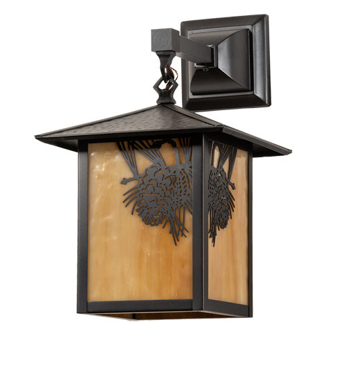 Pine Cone laden branches accent this handsome American Craftsman lantern style curved arm wall sconce. The fixture, handcrafted in the USA by Meyda...