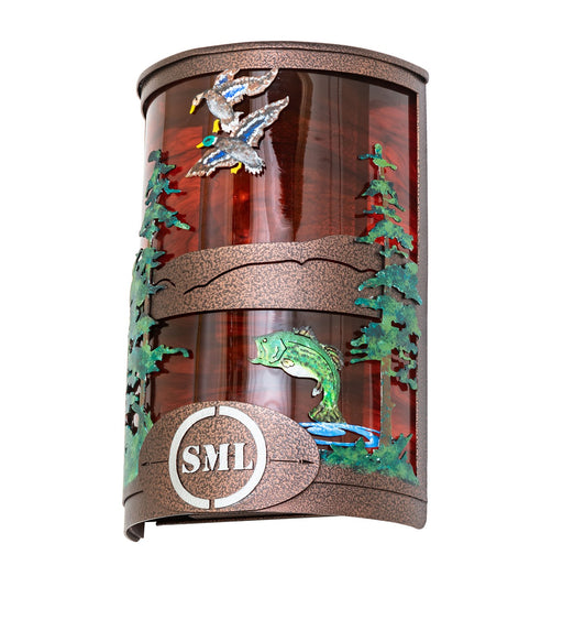A Fly Fisherman landing his catch is depicted on this handsome American Craftsman lantern style curved arm wall sconce. The fixture, handcrafted in...
