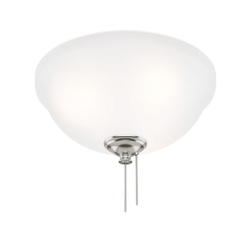 Three-light universal fan light kit features alabaster style glass shades beautiful in design. Brushed Nickel finish corresponds with a Chrome pull...