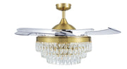 The stunning elegance of upscale glam décor offers functionality and lighting in the Fanaway Veil four-blade LED ceiling fan. Create a formal, palatial aesthetic in a modern or transitional space with a ceiling fan designed to stand out. This fan offers a three-tiered shade joining rows of delectable crystal elements forming a graduated silhouette. Shapely blades made of PC are retractable, delivering a convenient way to transform its look from a straight light to a fan circulating welcomed air. This dimmable four-blade, three-speed fan and light features a ceiling pitch of 15 degrees with a reversible motor consuming 60 watts. Easy operation by remote control makes this distinctive ceiling fan easy to use in a dining or living space, or in a custom upscale bedroom.