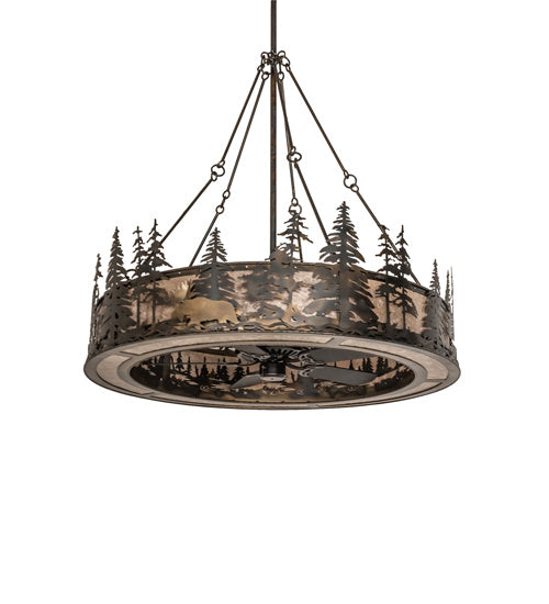 This iconic ceiling fixture features Moose and Bears meandering among the Tall Pine Tree woodlands at Dusk. This fan-integrated custom lighting fix...