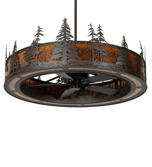 A stand of Tall Pines accents this fan-integrated custom lighting fixture with woodland metal silhouettes and hardware in an Oil Rubbed Bronze fini...