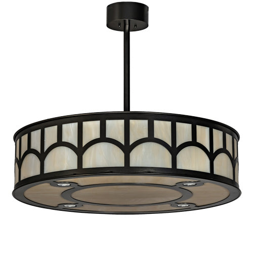 An Arts and Crafts Hil Top arched bar design is highlighted on this Custom Fan-Integrated Light Fixture, featuring a Sahara Taupe Idalight diffuser...