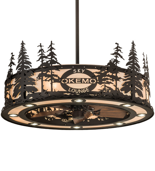 This custom lighting fixture integrates efficient fan technology. Handpainted Green Pine Tree silhouettes, complemented by metal hardware in Textur...