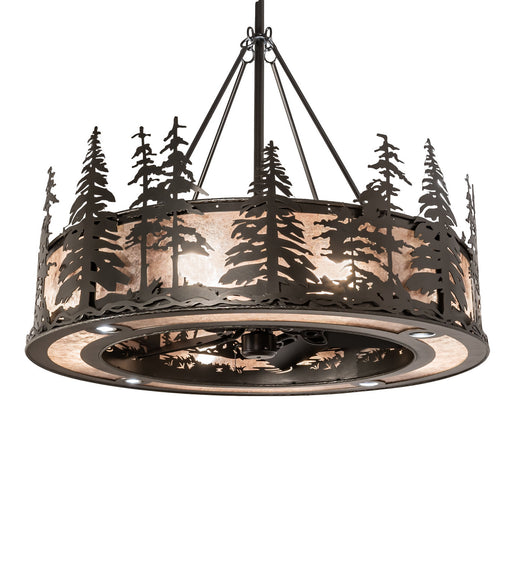 This exquisite fan-integrated custom lighting fixture features Pine Tree metal silhouettes in an Exterior Oil Rubbed Bronze. A Silver Mica diffuser...