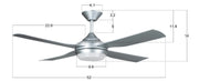The Lucci Air Moonah 52-inch 4 blade fan and LED light in silver with silver blades. The Lucci Air Moonah comes with high-performance ABS blades, diecast motor, 3-speed remote control with wall holster. The integrated non-dimmable LED light kit will brighten your room or patio with 890 lumens in a 3000k warm white light. The Lucci Air Moonah is covered by our lifetime limited warranty for years of breezy indoor or outdoor comfort. Additional downrods to customize the height of your fan sold separately. Set includes: One (1) ceiling fan with remote control. Material: ABS and Steel. Finish: Silver. Ceiling fan dimensions: 12 inches high x 52 inches wide x 52 inches deep. Blade dimensions: 22 inches length x 5.5 inches width, Blade color: Silver. Winter/Summer mode manual switch. D7x0.6 motor. Airflow(CFM): 5207.85. Number of speed: 3. Power Consumption Average(wattage): 75. Motor Wattage: 75W. Include 18W LED, 1300LM, 3000k. Non Dimmable. RPM H/M/L (motor speed): 215. Fan Watts when used at high speed: 65W. Voltage: 120Vac, 60Hz. Ceiling Fandimensions: 12 inches high x 52 inches wide x 52 inches deep. This product will ship to you in one (1) box. Accessories pictured are NOT included. Assembly required.