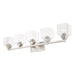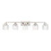 This bath vanity light is sure to provide reliable illumination without sacrificing style. It features five clear seeded glass shades with an open bottom, exposing the bulbs inside. A brushed nickel finish covers the backplate and accents the light.