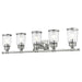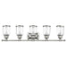 Our Lawrenceville collection features a retro industrial design, reminiscent of 19th century lighting. This five light bath vanity comes in a polished chrome finish and clear seeded glass.
