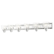 Bring a beautiful new look to your bathroom or vanity area with this charming extra-large six-light vanity sconce from the Birmingham collection. A wide rectangular polished chrome finish back plate supports six simple graceful arms that hold six hand blown clear glass shades. The clean lines of this updated classic will make this piece an appealing part of your home.