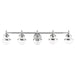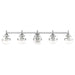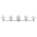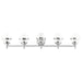 Sleek and simple lines define this beautiful polished chrome finish five-light large vanity sconce from the Oldwick collection. The clean, bold look of modernity blends with a raw industrial inspiration and hand blown clear glass give this design a versatile and eclectic look that works with nearly any style of home decor.