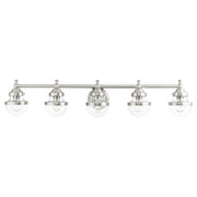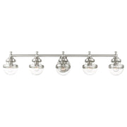 Sleek and simple lines define this beautiful brushed nickel finish five-light large vanity sconce from the Oldwick collection. The clean, bold look of modernity blends with a raw industrial inspiration and hand blown clear glass give this design a versatile and eclectic look that works with nearly any style of home decor.