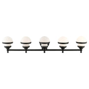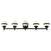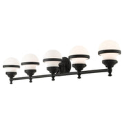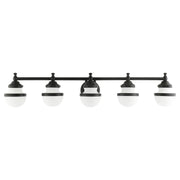 Sleek and simple lines define this beautiful black finish large five-light vanity sconce from the Oldwick collection. The clean, bold look of modernity blends with a raw industrial inspiration and hand blown satin opal white glass give this design a versatile and eclectic look that works with nearly any style of home decor.