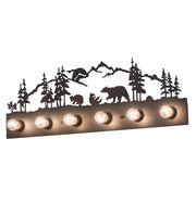The call of the wild comes to light with three Bears roaming through the Tall Pine woodlands with the mountains seen in the background. Beautiful ambient light shines from six Edison-style lamps while the fixture is enhanced with accents and hardware featured in a Textured Black finish. The vanity light can be installed in fine baths and corridors in residential, hospitality, and commercial spaces. The Bear Family 6 Light Vanity Light is featured in our American-made, American-designed, handcrafted Wildlife Lighting Collection. This fixture is manufactured in Yorkville, New York. It is UL and cUL listed for dry and damp locations. Upstate New York's adventurous playland, known as the Adirondack Mountains, with its many breathtaking forests, lakes, and rivers, is the spiritual birthplace of Meyda and inspires our rustic-themed collections.