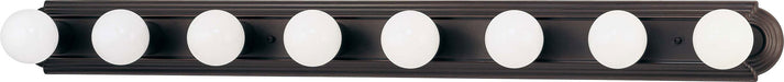 Satco's 8-light, 48-inch racetrack vanity is an elegant lighting solution for the home. Illuminate your bathroom, hallway or other interior spaces with the perfect combination of form and function. Designed to cast a soft white light over a wide area, this fixture, available in polished chrome, brushed nickel, old bronze, polished brass, mahogany bronze and traditional white finishes is sure to impress your guests with its style and elegance.
