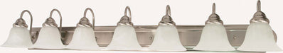The Ballerina 7 light, 48 inch vanity fixture features a brushed nickel finish, accented with alabaster glass bell shades. Illuminate bathrooms, hallways, and foyers with this elegant lighting solution for the home. Sleek and traditional, impress your guests with this seven light vanity.