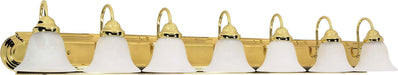 The Ballerina 7 light, 48 inch vanity fixture features a polished brass finish, accented with alabaster glass bell shades. Illuminate bathrooms, hallways, and foyers with this elegant lighting solution for the home. Sleek and traditional, impress your guests with this seven light vanity.