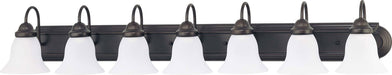The Ballerina 7 light, 48 inch vanity fixture features a deep rich mahogany bronze accented by Frosted White glass. Illuminate bathrooms, foyers, or any room in the home with this seven light vanity. Stylish and elegant, impress your guests with this seven light vanity.