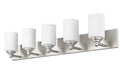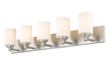 Highlight the classic minimalist look of a five-light vanity light embellished with tastefully subtle accents. From the Soledad collection, this fixture features a straightforward silhouette with brushed nickel finish steel serving as a rectangular wall plate and holder, and five side-by-side chic cylinder shades made of delicate white opal glass. This vanity light may be mounted facing up or down in an en suite or guest bath space.