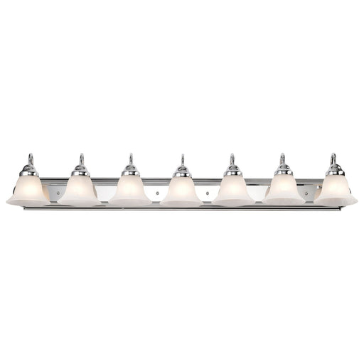 The Ballerina 7 light, 48 inch vanity fixture features a polished chrome finish, accented with alabaster glass bell shades. Illuminate bathrooms, h...