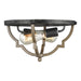 The Socorro two light flush mount fixture in stardust provides abundant light to your home, while adding style and interest. The transitional Socorro lighting series by features a classic, barbed Quatrefoil profile - wholly updated by combining a distressed Cerused Oak finish on the decorative silhouette with the rich Stardust finish on the metal bobeches and decorative strapping to create undeniable rustic charm. While still offered in its original finish Stardust, the Socorro has been beautifully updated with our popular Washed Pine and Chrome finish to offer a modern take on this timeless industrial beauty. The collection includes a four-light mini-chandelier, medium and large six-light chandeliers, and four-light and six-light hall / foyer pendants. Incandescent candelabra base lamping.