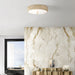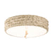 Light up any space in glamorous style with this 16 inch round white and beige flush mount. This sophisticated 3 light ceiling fixture, features a cylindrical hand painted frame that uses texture to create the decorated pattern that is used in our trellis collection. There is depth to this finish, and touches of brown, silver and a little gold are used as accents. Complete with a frosted glass diffusor to spread the light evenly around the space, and a beautifully sculpted finial to add that finishing touch.