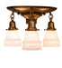 Inspired by a famous Revival lighting design from the early 1900s... This Brass ceiling fixture is created with three mouth blown shades featuring White Art Glass. The decorative shades are embraced by elegant cast metal hardware featuring a Brushed Brass finish. The Revival Garland 3 Light Flushmount is featured in our American Made, American designed, handcrafted Revival Lighting Collection. Manufactured in Yorkville, NY. UL and cUL listed for dry and damp locations. Each shade is a unique work of art with color variations based on natural ingredients inherent in the glass.