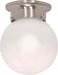 Satco's 1-light, 6 inch flush mount, ball shaped fixture features a brushed nickel finish, accented with white glass. Illuminate living rooms, dining rooms, and foyers with this elegant round fixture. Traditional, yet contemporary, this 1-light flush mount adds style to any home.