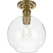 Incorporate a clean design with generous scale with a flush mount from the Hansford Collection. A clear globe-style glass shade with an open-rimmed bottom is held in place by a knurled metal light base. The light fixture's circular ceiling plate is coated in a golden vintage brass finish.