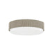An opal glossy glass shade is wrapped by grass cloth and accented with Patina Brass, taking a recognizable silhouette and giving it a modern rustic upgrade. The earthy grey tones of the grass cloth make this flush mount extremely usable in many different interiors.