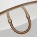 The Katie two light flush mount fixture in time worn brass features a leather stirrup stemming from a milk white glass diffuser and white linen fabric shade.
