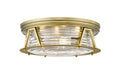 Delivering bright lighting for a modern space, this brass and glass four-light flushmount ceiling light covers all design bases with a nautical-inspired motif serving industrial, modern, and Art Deco aesthetics. Emulating a Fresnel lens found in historic lighthouses on coastal North American shores, this light from the Cape Harbor collection blends chic ribbed glass with warm rubbed brass finish steel to create versatility and an expressive look in any contemporary or transitional space.