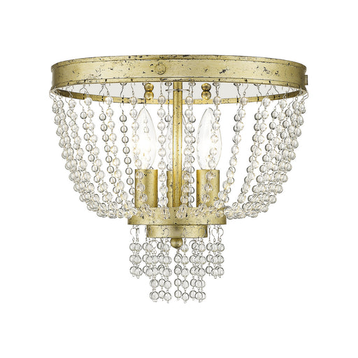 A beautiful cascade of clear crystal beads creates a striking effect of refracted light. This three light flush mount is finished in a hand applied...