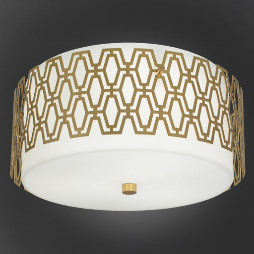 Antique Brass Finish Chase Flushmount With Frosted White Glass Shade - Chase is an attractive collection with a crisscrossed, metal frame work that...