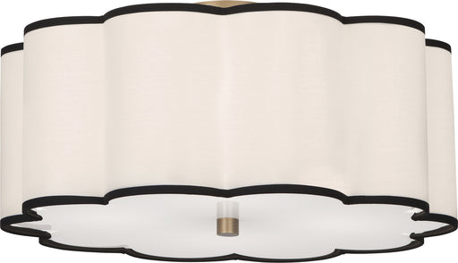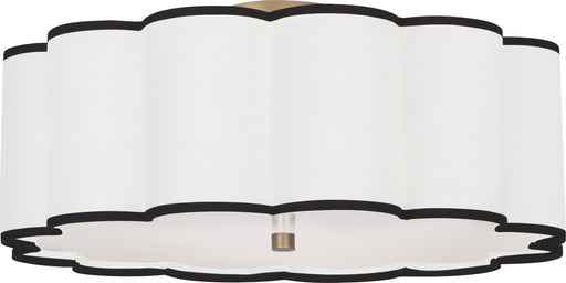 Aged Brass Finish Axis Flushmount With Scalloped Fondine Fabric Shade with Black Contrasting Trim - Axis features a scalloped design that diffuses ...