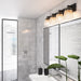 The "Eastwood" collection bathroom vanity features thick frosted glassware with a black frame and plated brushed nickel accents.