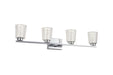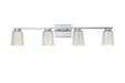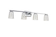 The Dalton Collection features a distinctive design with a clear outer glass surrounding a interior seeded cylinder glass, creating a unique and modern aesthetic. The LED lighting is skillfully integrated to accentuate the seeded glass, providing a visually striking and exceptional effect. Show in with a chrome frame (also available in black). Additionally, these models have a built-in LED switch, allowing users to effortlessly adjust the color temperature from 3000, 4000, and 5000 kelvin for a customizable lighting experience. This collection seamlessly combines functionality with an eye-catching design, making it an elegant choice for any bathroom space. 4 light wall sconce shown. (Also available in a single and 3 light versions.)