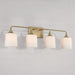 Sleek contours and flared accents create the Presley 4-Light Vanity for HomePlace. The soft white glass paired with Aged Brass finish brings a classic aesthetic that mixes with any style. Also available in 2-Light or 3-Light.