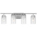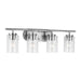 The Oslo four light vanity fixture in Brushed Nickel offers shadow-free lighting in your powder room, spa, or master bath room. The Oslo lighting collection by is a sleek design, with smooth and clean lines. The Clear Seeded glass adds to this collection's contemporary and minimalist character. Offered in Chrome, Brushed Nickel, Bronze and Midnight Black finishes, the collection includes nine-, five-, and three-light chandeliers, mini pendant, both flush and semi-flush ceiling fixtures, as well as one-, two-, three- and four-light wall/bath fixtures. Both incandescent lamping and ENERGY STAR-qualified LED lamping are available. All fixtures are California Title 24 compliant.