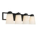 Lighting is the jewelry of the home, which makes this Russo 4-light bath vanity light a beautiful bauble for the bathroom. Attention-grabbing geometric detail is finished in warm brass to pair beautifully with the overall matte black finish. White glass shades ensure bright and even illumination. Russo is 7.25" in height, 32" in width and 6.25" in extension. It uses 4 standard size bulbs of up to 60 watts each (bulbs not included). Damp area rated.