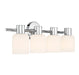 This Strand 4-light bath vanity light has a crisp, clean, modern look that is ideal for stylish homes. White glass shades ensure a comfortable and even glow. Chrome finish. Strand is 8" in height, 23.25" in width and extends 6.25" from the wall. It uses 4 standard size bulbs of up to 60 watts per bulb (bulbs not included).