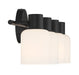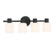 This Strand 4-light bath vanity light has a crisp, clean, modern look that is ideal for stylish homes. White glass shades ensure a comfortable and even glow. Matte black finish. Strand is 8" in height, 23.25" in width and extends 6.25" from the wall. It uses 4 standard size bulbs of up to 60 watts per bulb (bulbs not included).