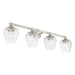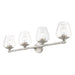 This four light vanity sconce from the willow collection has understated elegance. It features minimal details, clear curved glass with a brushed nickel finish and can fit into any decor.