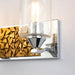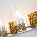 Clean lines and timeless design this 4-light vanity light is perfect for brightening your bathroom space giving it texture and dimension. Featuring a clean-cut rectangle backplate with textured traditional shapes, simple curved arm and a unique two-toned finish of polished chrome and antique gold. Showing off its contemporary side, this 4-light bathroom light uses a cylinder shaped clear seeded glass to bring attention to the mix of texture and details that come together in our Bocage collection. Measuring 35" Wide, 8" in height and 6.5" in depth, this four-light vanity light can fit in nearly any space.