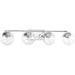 Giving a nod to the space age with mid-century modern appeal, Mod features a sleek linear frame in a Polished Chrome finish. Clear, spherical glass shades offer the perfect focal point for vintage bulbs or reflector-style globes. This four-light fixture can be used in the bath and vanity works with wide variety of styles.