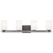Enjoy high status with a four-light bath and vanity in the Lisbon Collection that is full of femininity, gleam and shine. Etched opal glass shades sit atop an elegant K9 glass rod, highlighted with a Black finish. The highly polished design style complements both Modern and Luxe interiors - and can be mounted up or down.