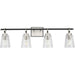 The Cassell Four-Light Vanity Fixture brings an enduring style to the bath. The light boasts a dual-tone finish of Brushed Nickel and Matte Black that accentuates its distinguished and handsome design. Tailored details smoothly blend linear precision with elegant circular rings and clear glass shades.