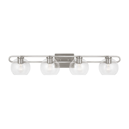 The Codyn four light vanity fixture in brushed nickel silver is a contemporary take on a classic mid-century design. Clear glass shades with open-e...