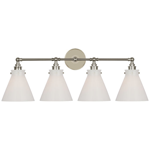 Details:Product Type: Four LightsFinish: Polished NickelShade: White GlassDesigner: Chapman & MyersMeasurements:Width / Dia: 32.50"Height: 11.5...